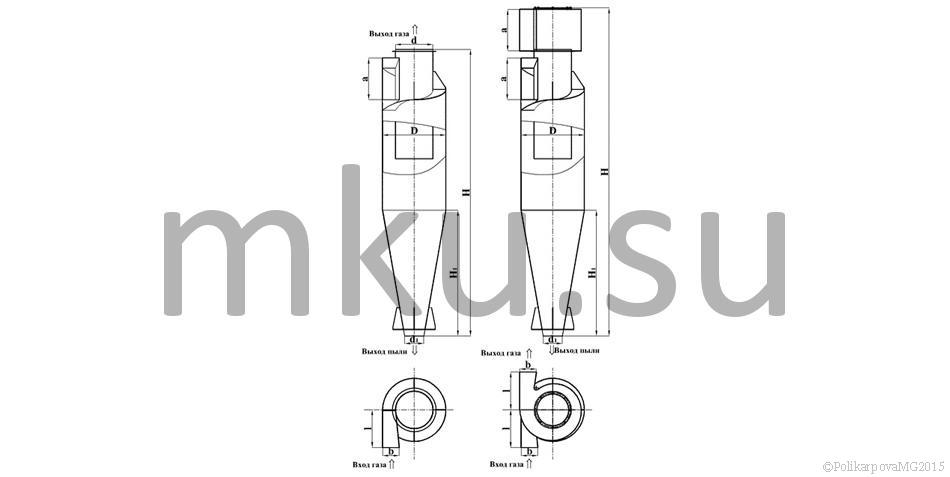 Циклоны ЦН-15-400 группового исполнения производят с вращением потока газов "левого" или "правого" типа, одиночные циклоны существуют только с вращением "правого" типа.